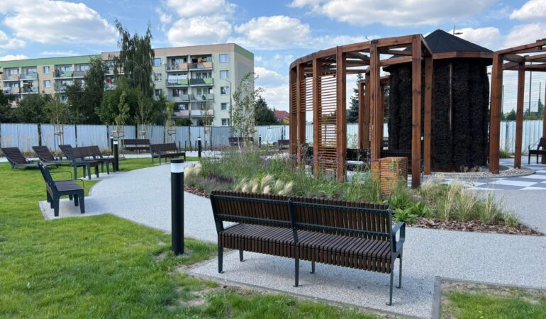 postanowiło jednak rozszerzyć inwestycję i tężnię na Stawkach wzbogacić o park kieszonkowy, zawierający między innymi pergolę i zielony skwer.